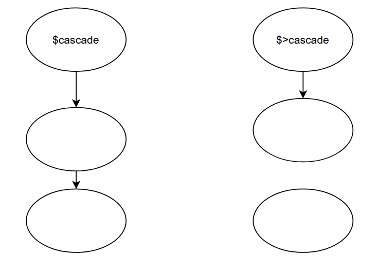 Sự khác biệt đơn giản giữa $cascade và $>cascade là sự trao đổi giữa sức mạnh và tốc độ giữa 2 cái: $cascade có thể điều kiện từ cha xuống cháu, trong khi $>cascade chỉ có thể điều kiện xuống con trực tiếp của nó: