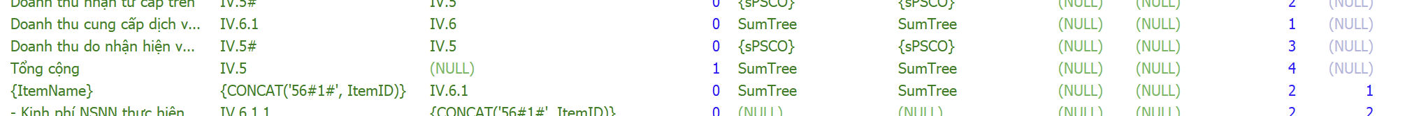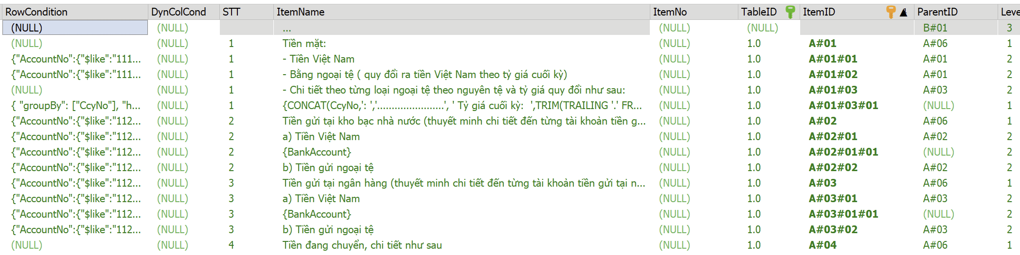 - Ngược lại, đối với các hàng có thì sẽ được xử lý tương ứng với công thức sql ở đó, chẳng hạn dòng A#03#01#01 sẽ in các tài khoản ngân hàng qua {BankAccount} và như để ý ở A#01#03#01 công thức có thể nối với xâu tĩnh qua CONCAT