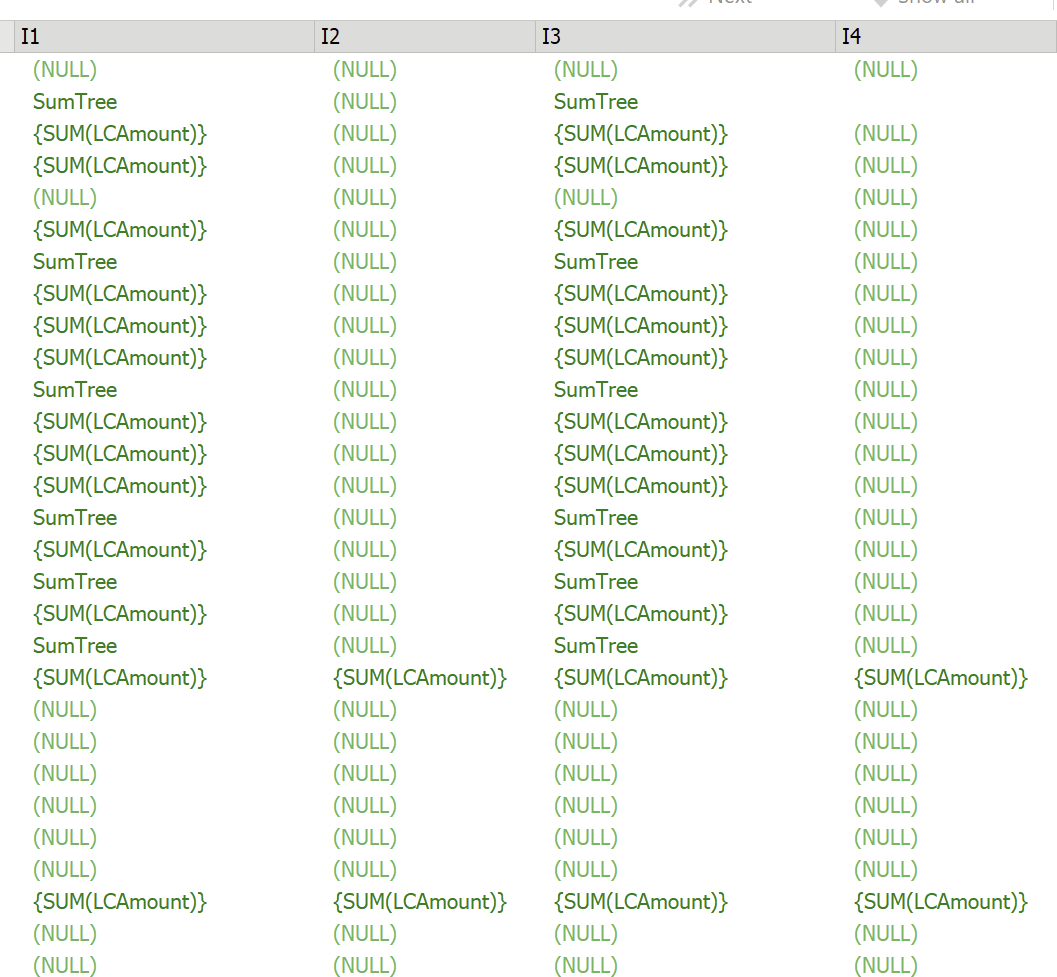 Ngoài những {SUM(LCAmount)} dùng để tính tổng như ở dưới đây, SumTree dùng để tính tổng của cây bóng cây, đơn giản mà nói: dựa trên ItemID và ParentID nó sẽ tự động tính hai cái sau: độ sâu của hàng đó trên cây báo báo và tự động tính tổng của hàng đó dựa trên các hàng con của nó. Nó là nâng cấp của IjReport::Formula bởi tự động hóa việc phải thủ công gán Level. Xong hiện tại nó cũng có nhược điểm sau: Hiện tại tại thời điểm viết ReportFrame không hỗ trợ cây đa rễ. Có nghĩa là nếu 1 hàng có nhiều 1 cha thì sẽ không được tính tổng lên cả hai hàng cha, thậm chí mà nói tại thời gian viết chưa cài đặt tính năng sao cho 1 hàng có thể có nhiều cha.